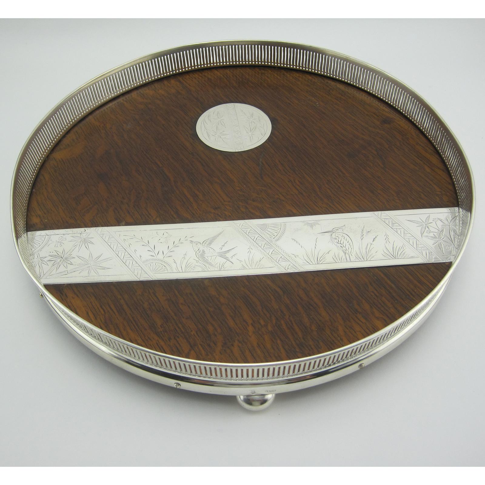 Aesthetic Movement Oak & Silver Plated Gallery Tray or Salver