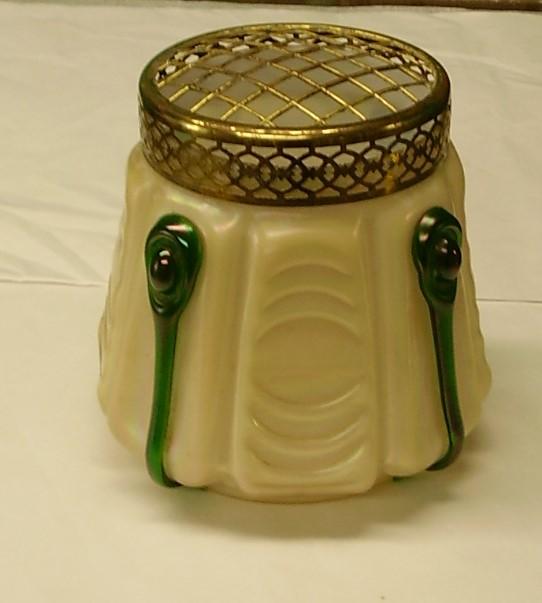Aesthetic White Loetz Style Glass Flower Vase with Green Overlays & Gilt Metal Grill