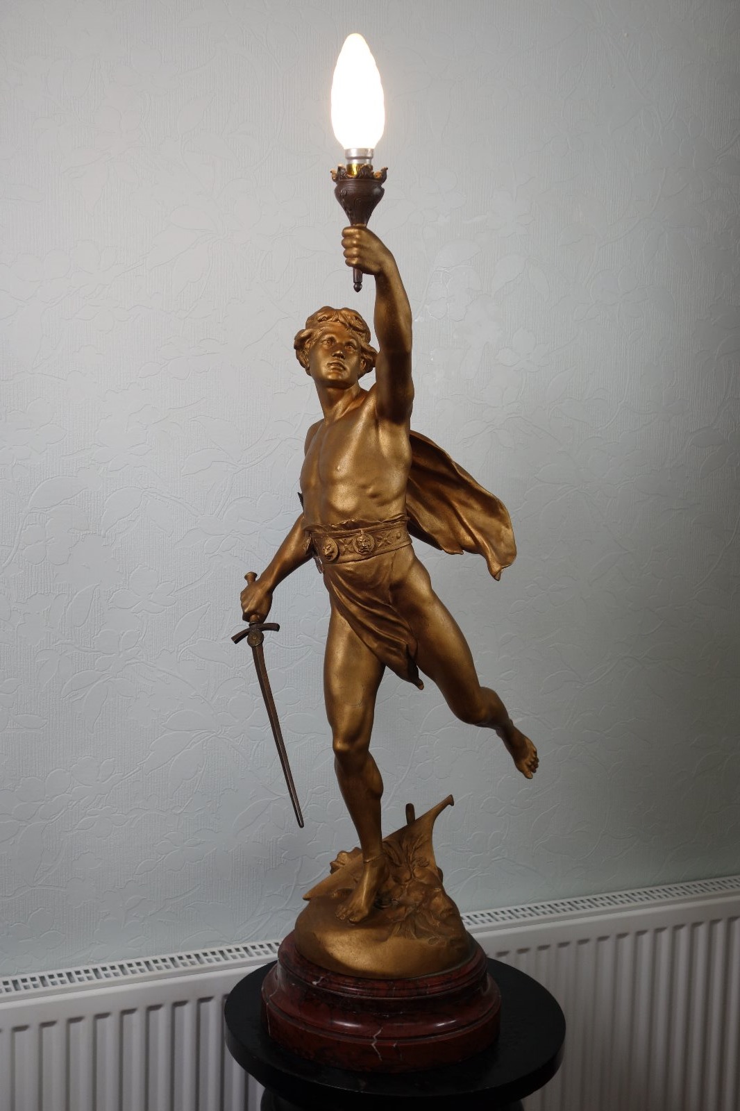 After E. Picault: "Victory" Bronzed / Gilt Large Spelter & Brass Lamp on Variegated Red Marble Base c.1900 (1 of 8)