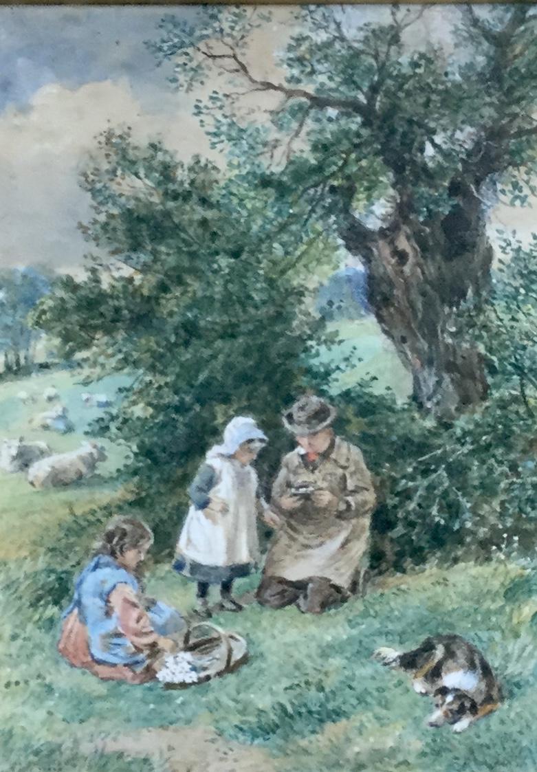 Alfred William Cooper Watercolour - Country Scene with Children, Farmer & Dog (1 of 2)