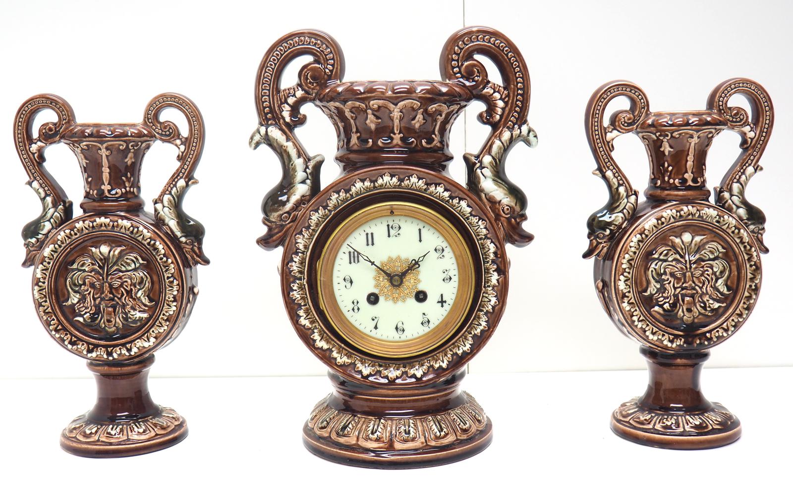 Amazing French 8 Day Majolica Mantle Clock Set Rare Pottery Mantle Clock Set (1 of 11)