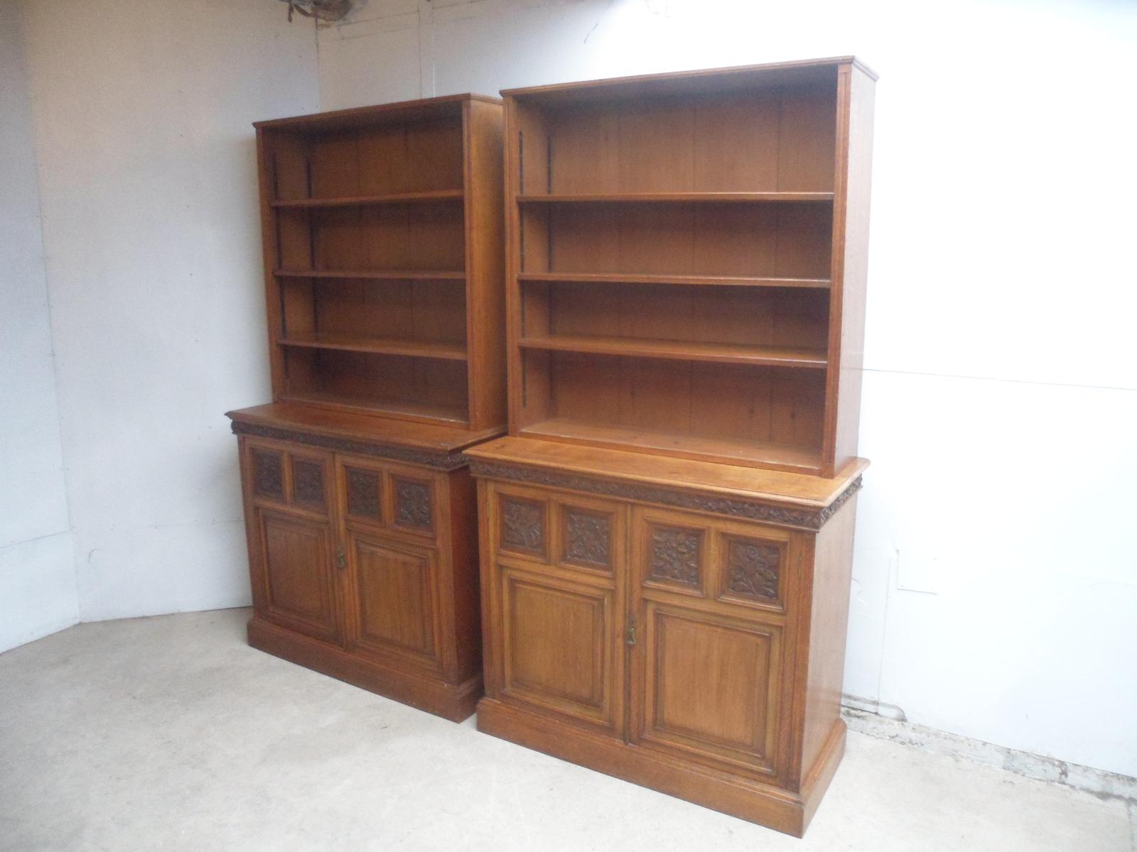 Amazing Matching Pair of Carved Victorian Golden Oak Adjustable Bookshelves