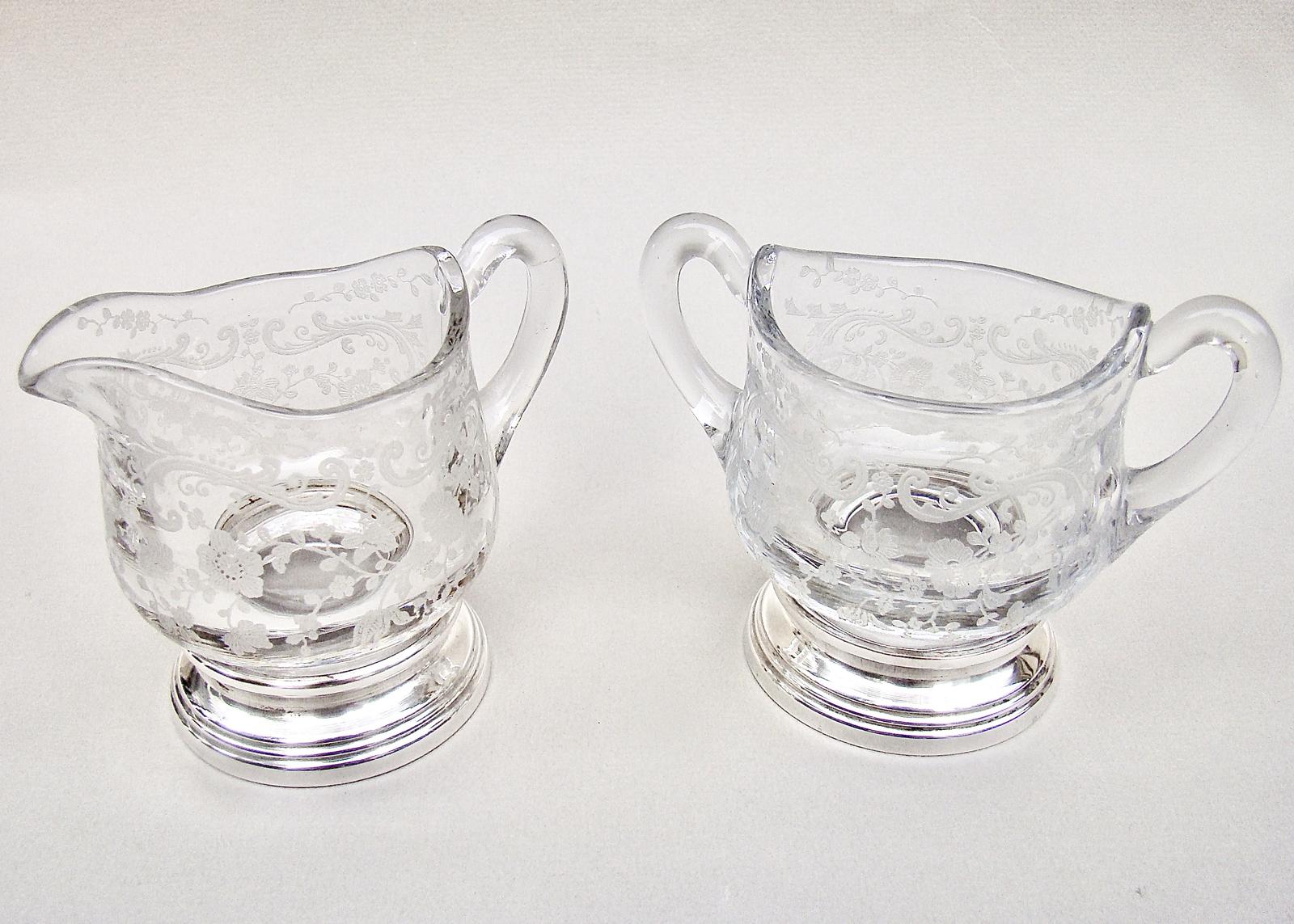 American Sterling Silver Chantilly Pattern Etched Glass Cream Jug & Sugar by The Sheffield Silver Co, New York c.1900
