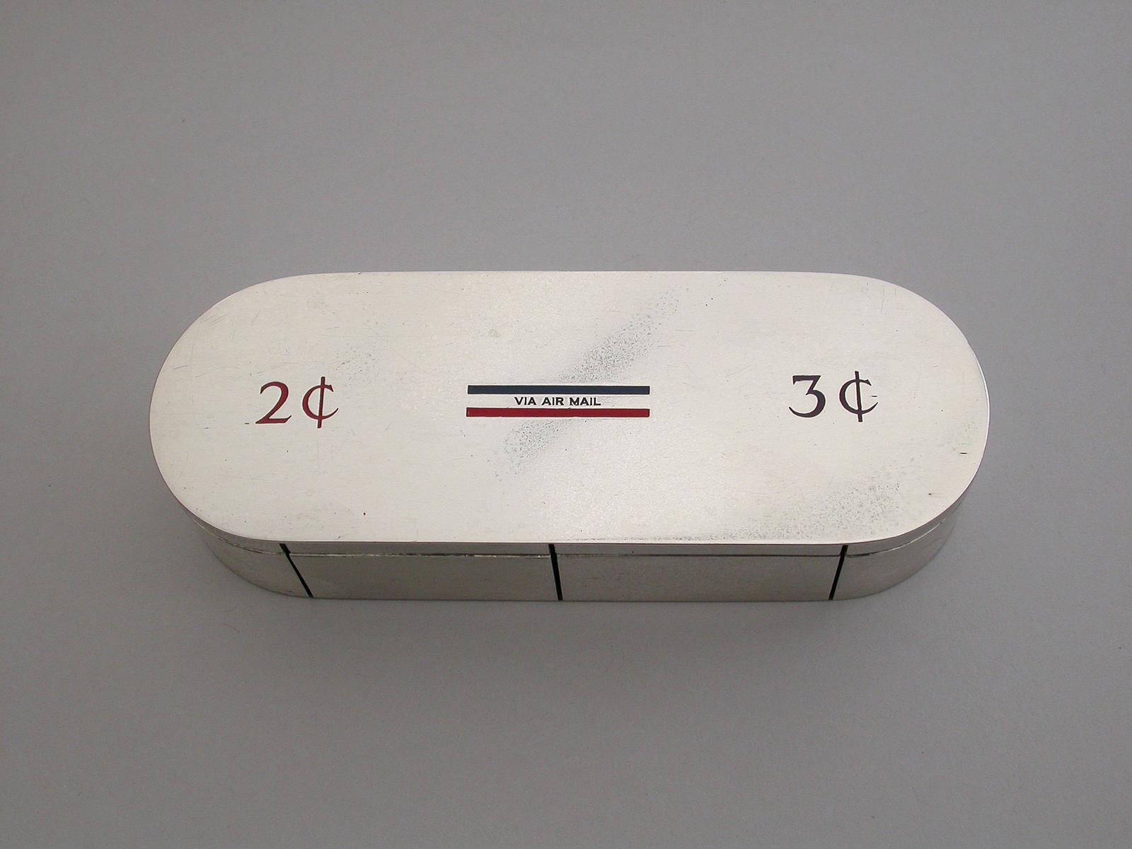 American Sterling Silver & Enamel 2 Cent, 3 Cent & Air Mail Stamp Roll Dispenser by The Thomae Co, Massachusettes, USA c.1930