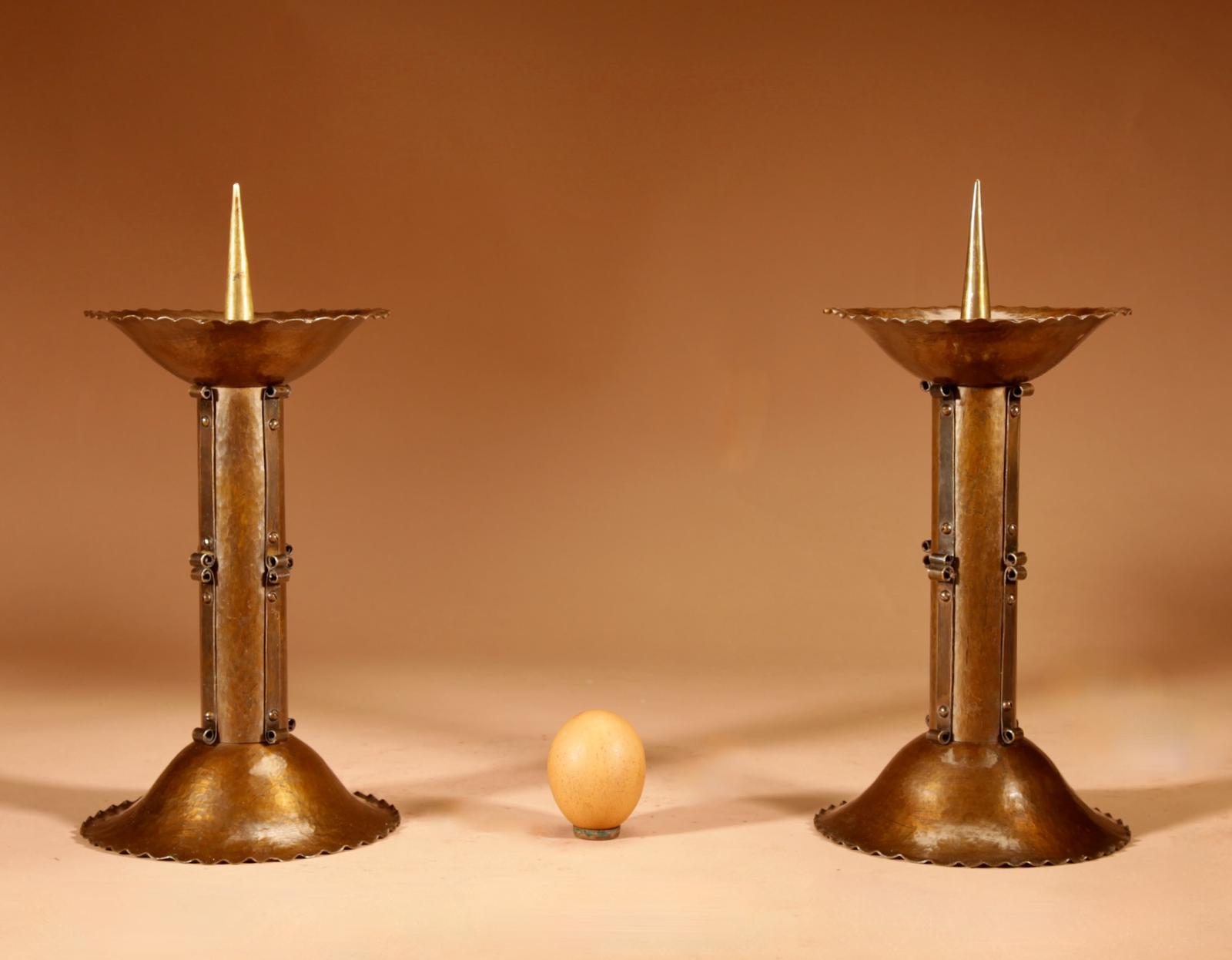 Amsterdam School Brass Pricket Patinated Candlesticks