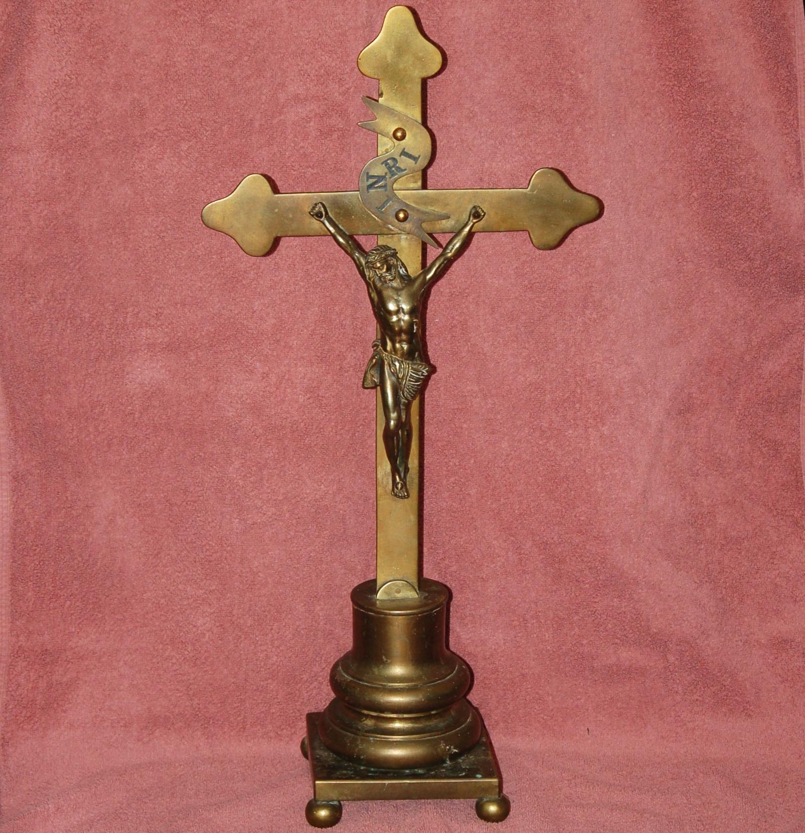 An Antique 19th Century Large Brass Inri Altar Cross, Church