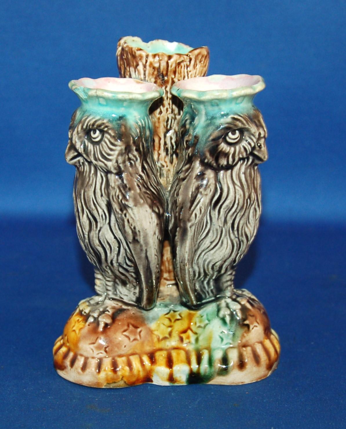 An Antique 19th Century Majolica Porcelain Dual Owl Bird Posy Vase