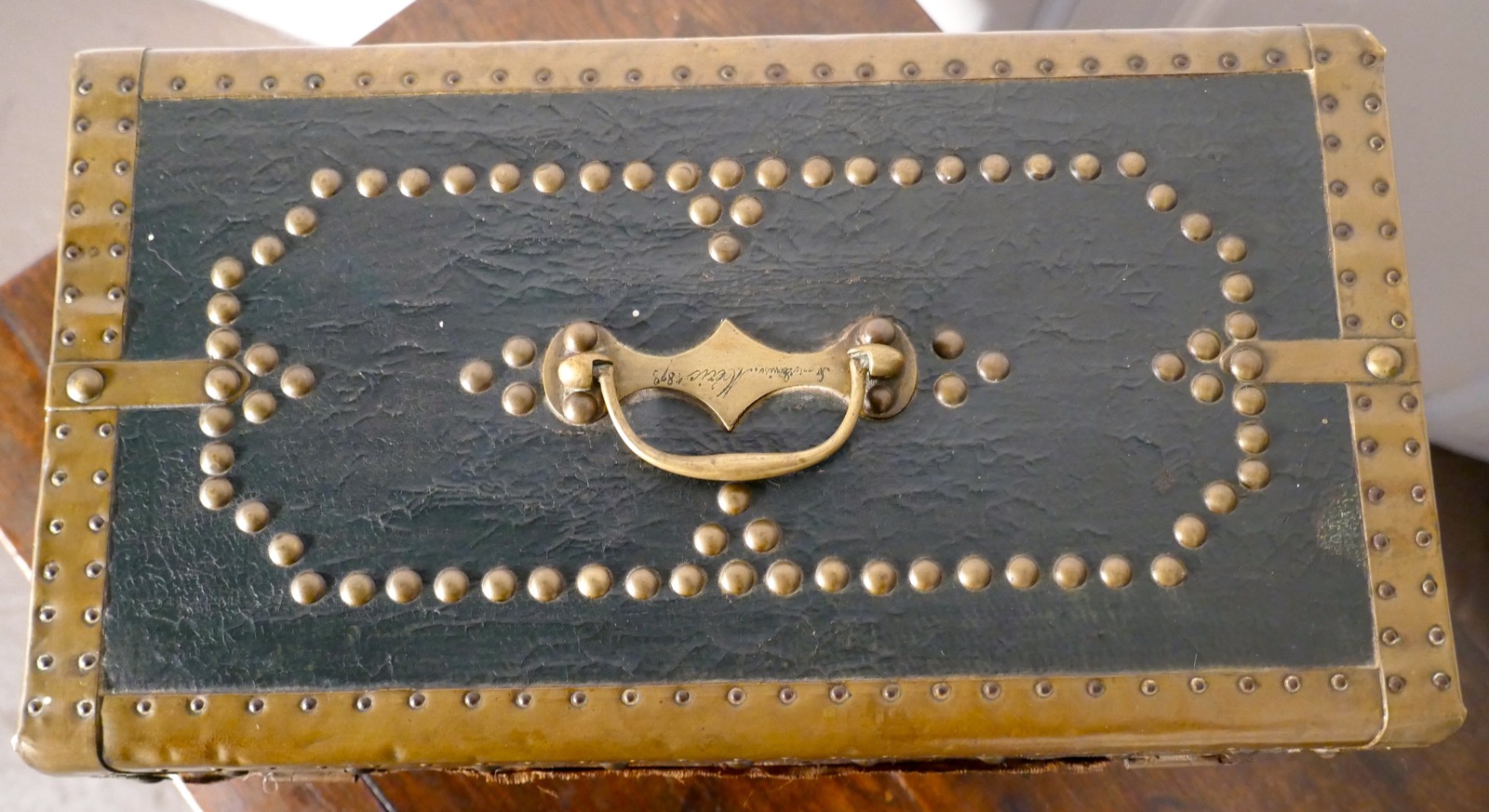 An Antique Leather and Brass Studded Treasure Chest or Jewellery Box 1878