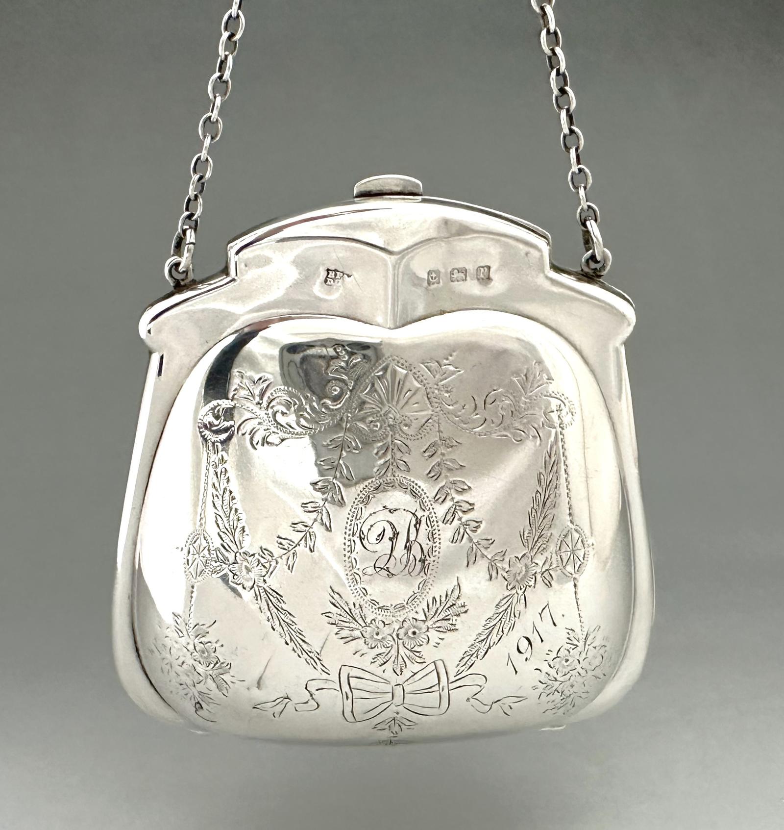 An attractive hallmarked silver cocktail purse from early in the reign of George V. This gorgeous piece has a shaped and engraved exterior, featuring floral and foliate swags, tied bows and shells. This pattern is repeated fully on the back. The purse is finished with a script initial 'B' to the central oval cartouche and the year '1917' engraved to the lower r/h side. The body is hinged, fitted with a push down clasp and belcher chain with finger ring. The interior is the original tan kid leather and is divided into three compartments. This elegant piece would have been probably used for evenings and cocktail parties and would make a lovely gift idea.