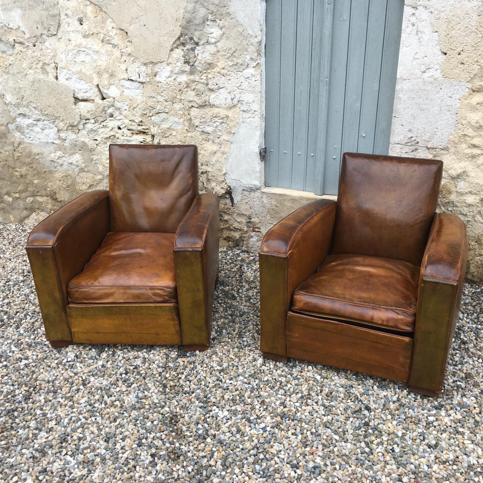 An Exceptional 1950s Fine Pair of French Club Leather Art Deco Armchairs