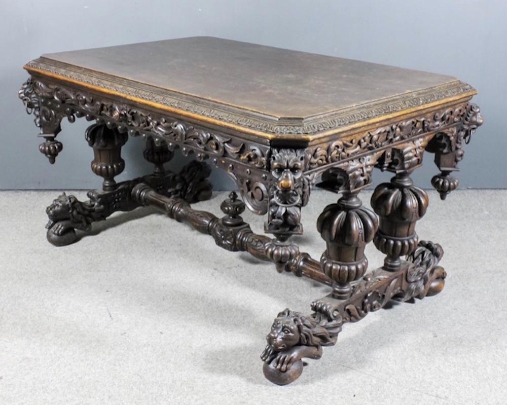 An Exceptional Antique Carved Gothic Revival Victorian Oak Library Table