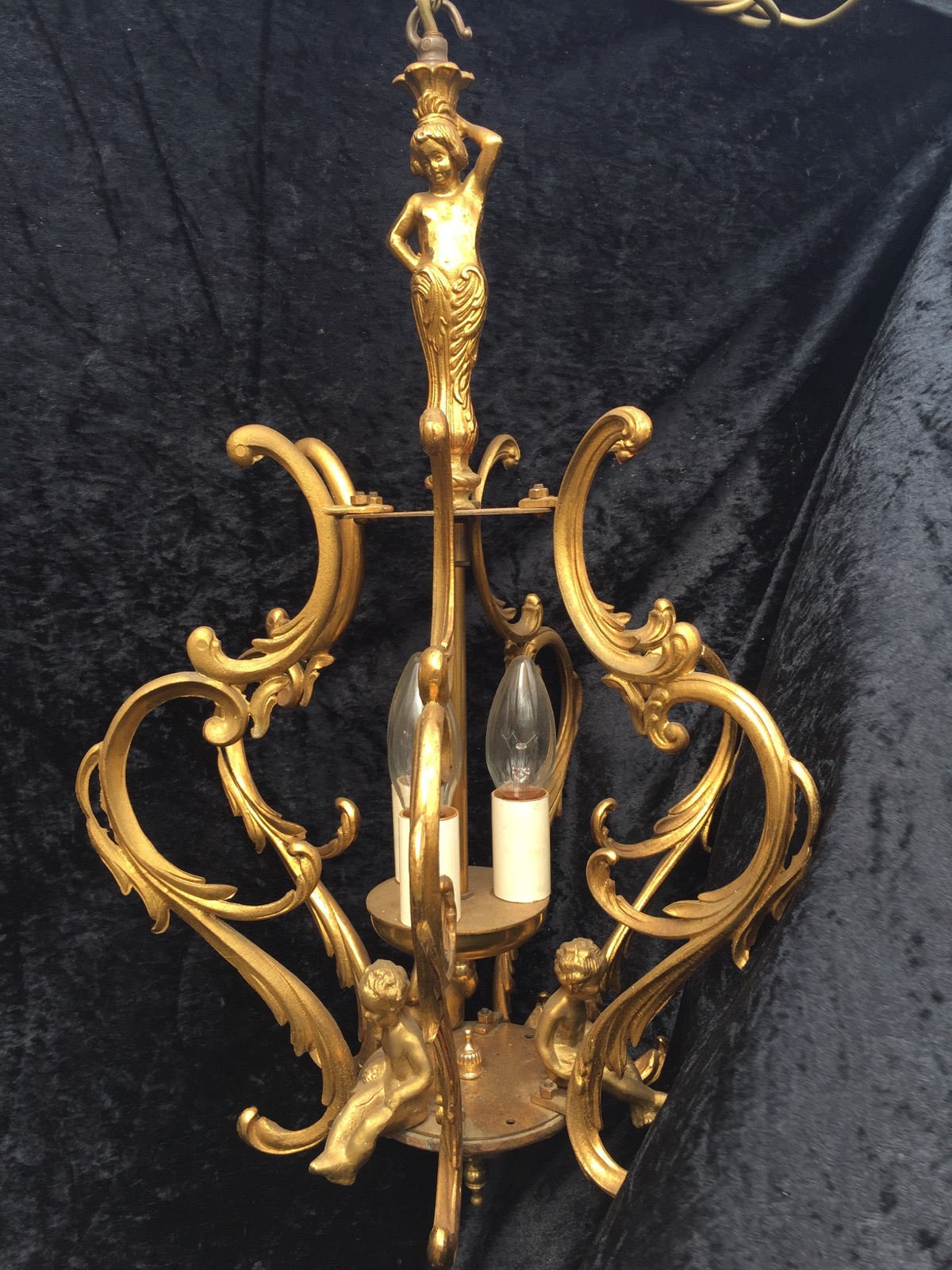 An Italian Brass Antique Open Lantern with Lady and Children Figures