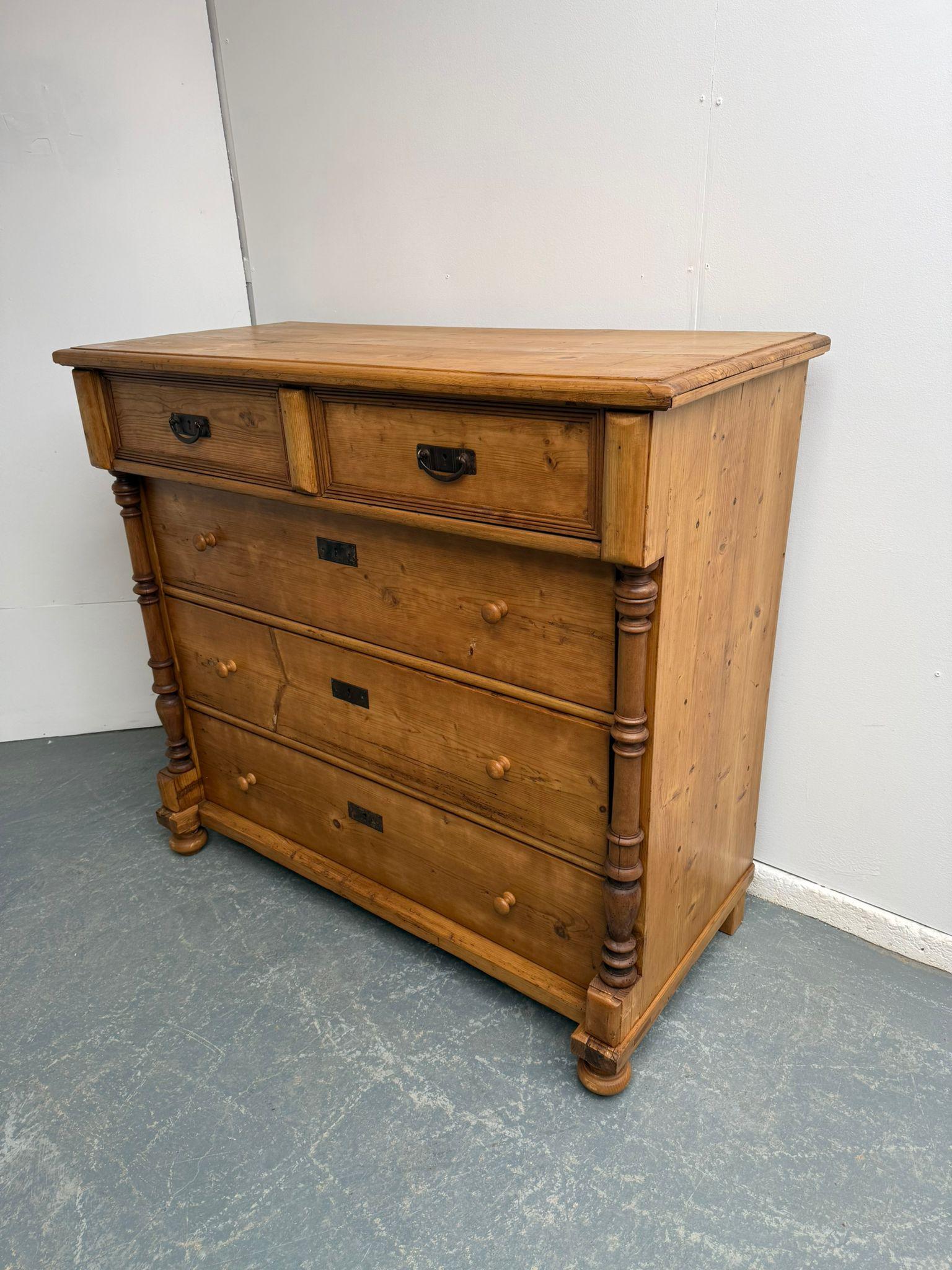 An Original Antique /old Pine Columned Hungarian Waxed 5 Drawer Chest of Drawers