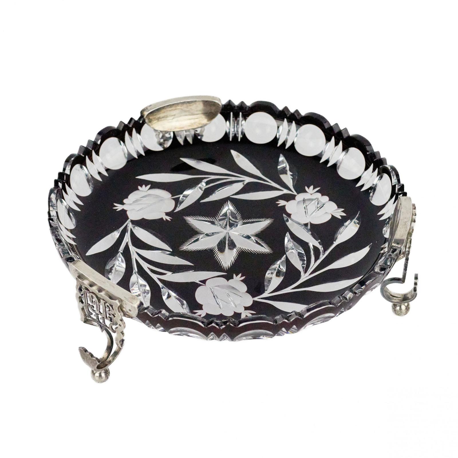 An original crystal dish on silver legs. Latvian version of Art Deco from the 1930s.