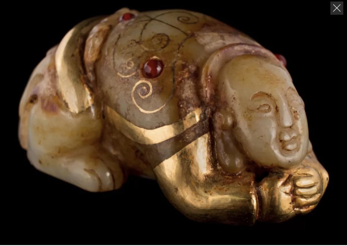 An Unusual Chinese Gold Mounted Jade Crouching Hotei with Red Cabochons Stones