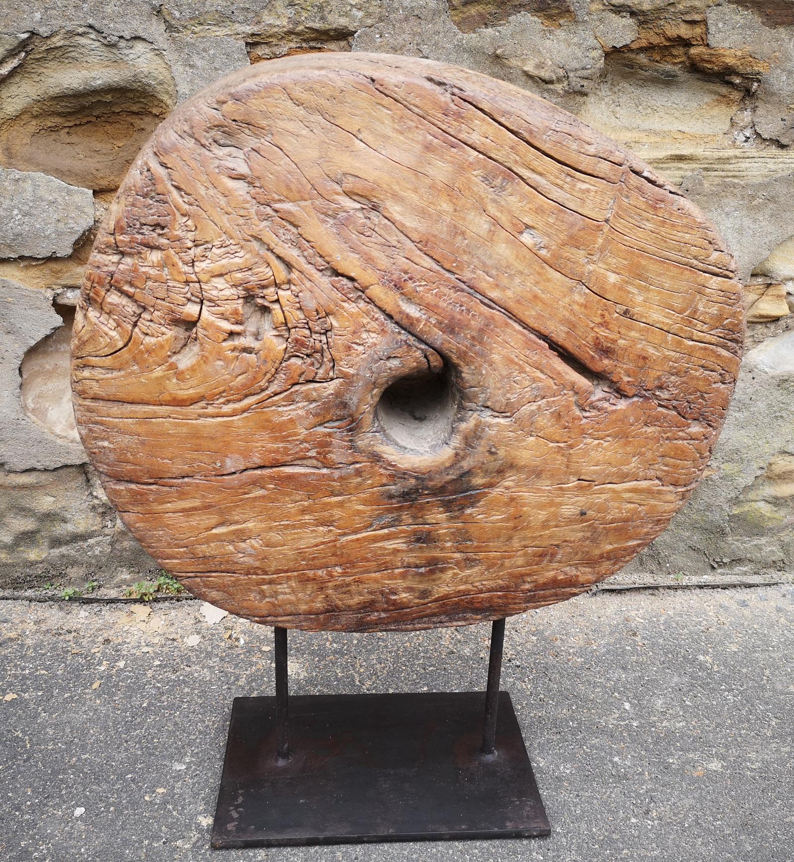Ancient Wooden Wheel Sculpture on Stand (1 of 7)