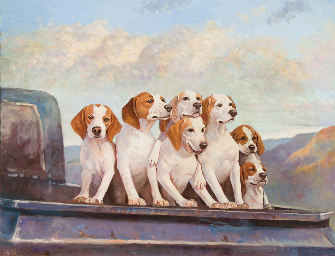 Andrew Quelch (B.1969) - Large Signed Contemporary British Oil, Beagle Dogs On Truck