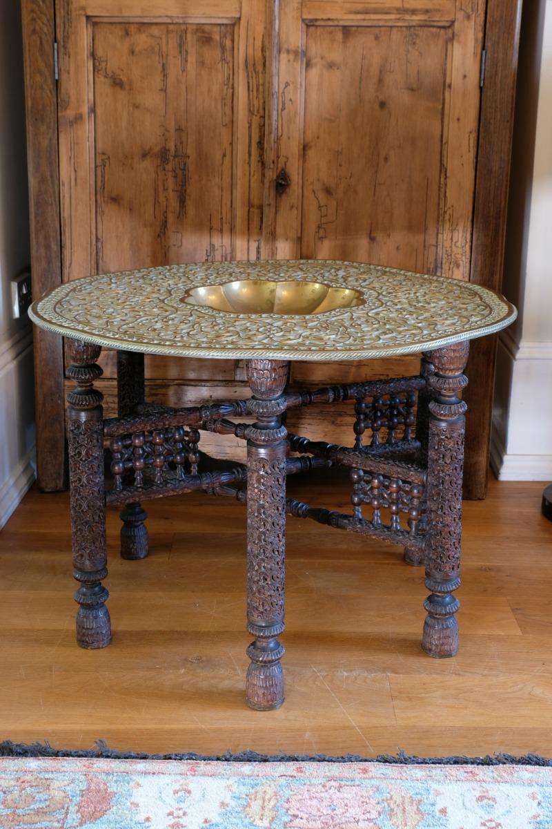 Anglo Indian Intricately Carved Table with Decorative Brass Top