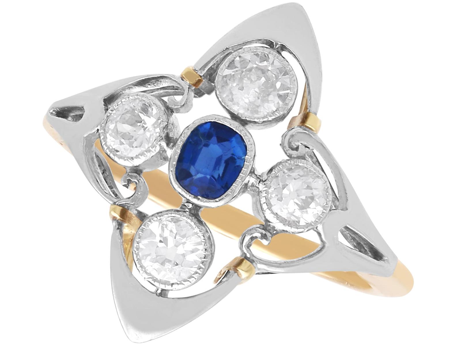 A stunning, fine and impressive antique 0.21 carat sapphire and 0.45 carat diamond, 14 karat yellow gold and platinum set dress ring; part of our collection of petite sapphire rings.