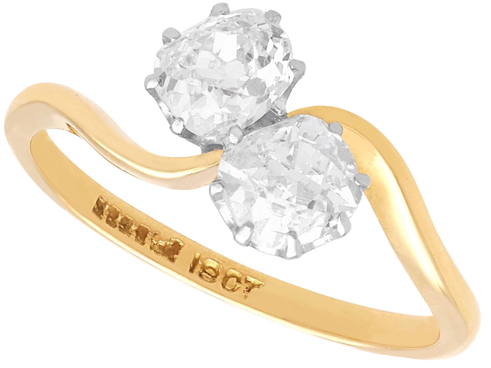 The platinum setting displays an impressive 0.52ct and 0.48ct Old European cut diamond, individually claw-set in a diagonal twist formation.