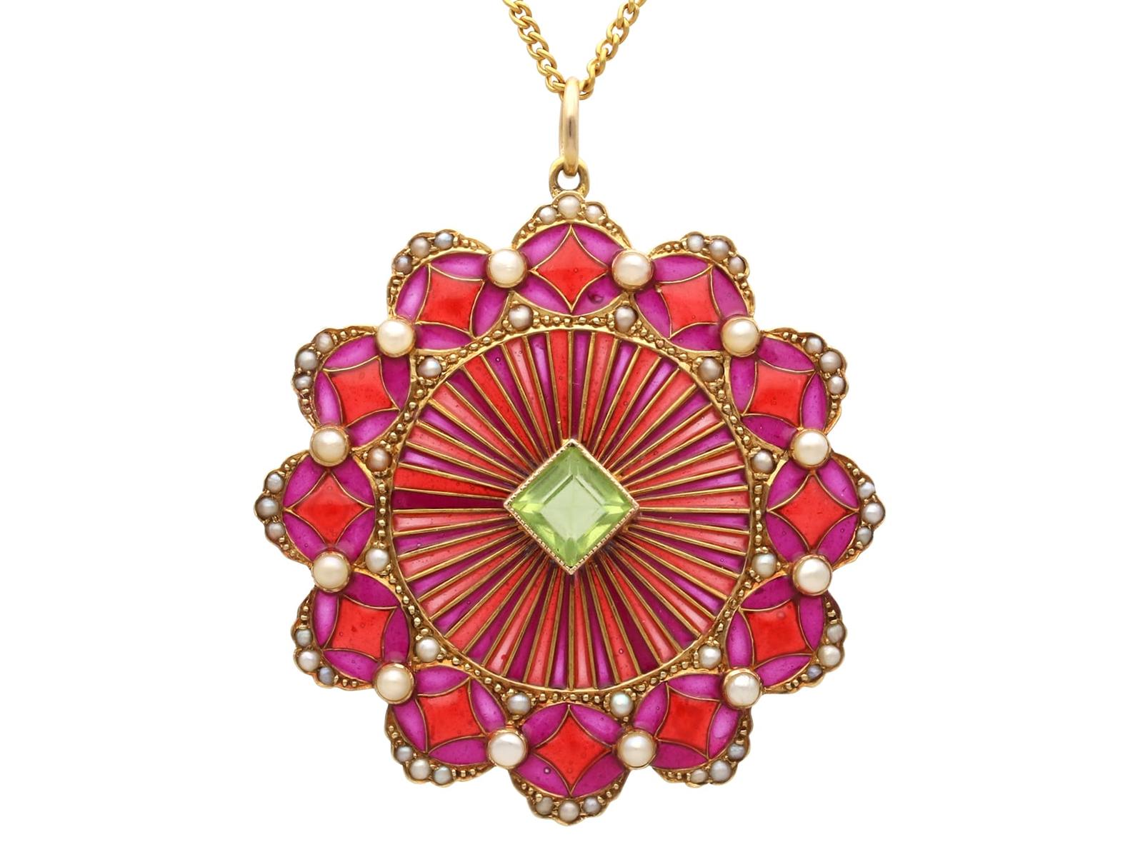 A stunning, fine and impressive antique 1.02 carat peridot and seed pearl, plique a jour, 15 karat yellow gold pendant; part of our collection of antique pendants.