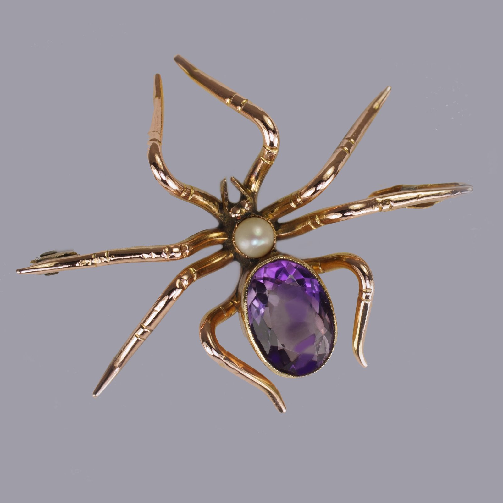 Antique 1.5" Spider Brooch / Pendant 15ct Gold Victorian Amethyst & Pearl Insect (1 of 1)