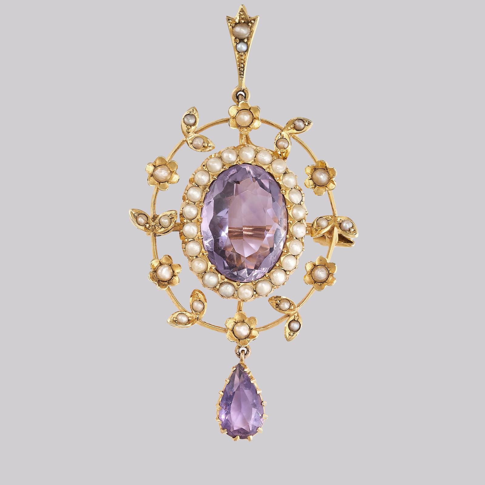 Antique 15ct Gold Amethyst & Pearl Pendant Edwardian Foliate Wreath Brooch 1905