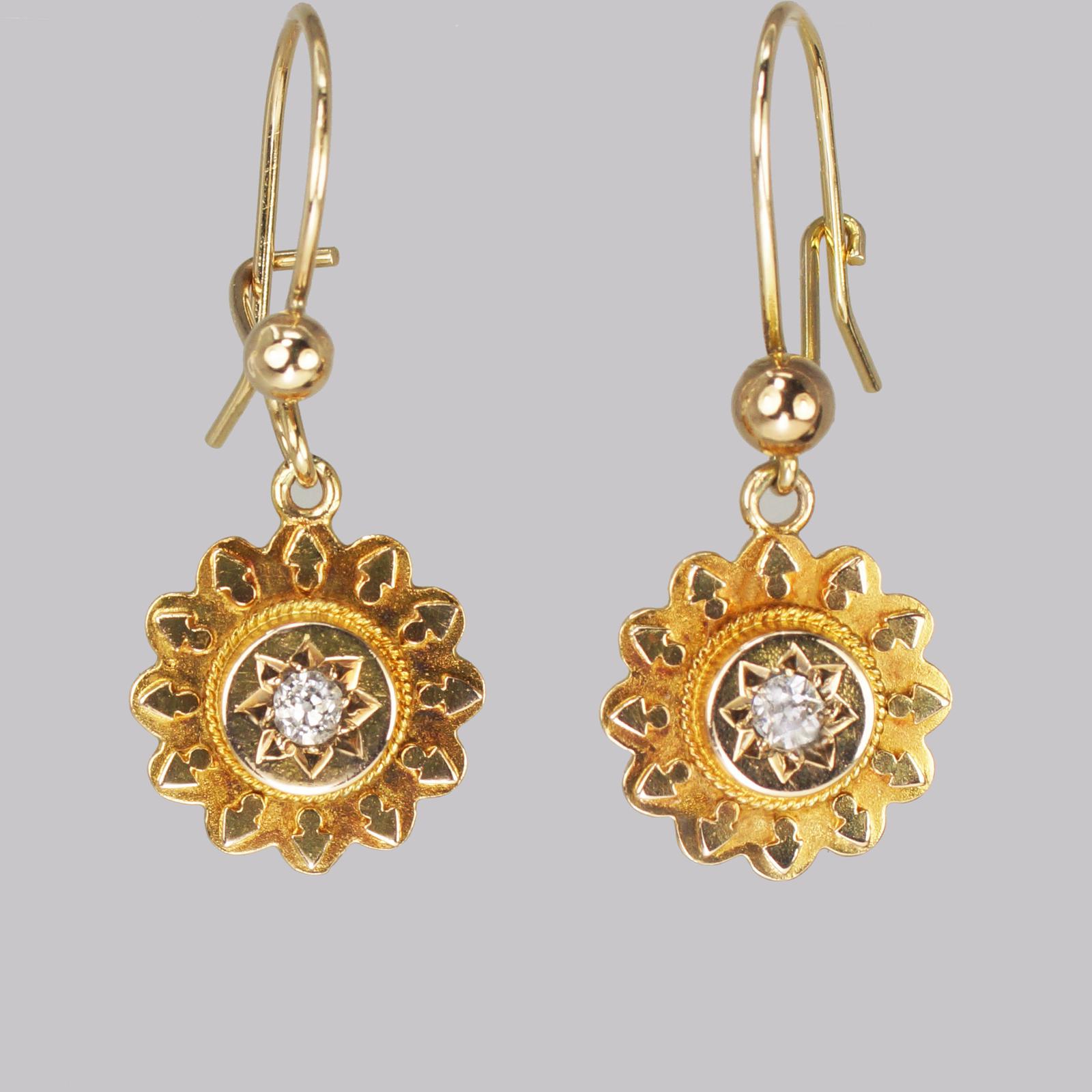 Antique 15ct Gold Diamond Victorian Drop Hook Etruscan Revival Earrings c.1890