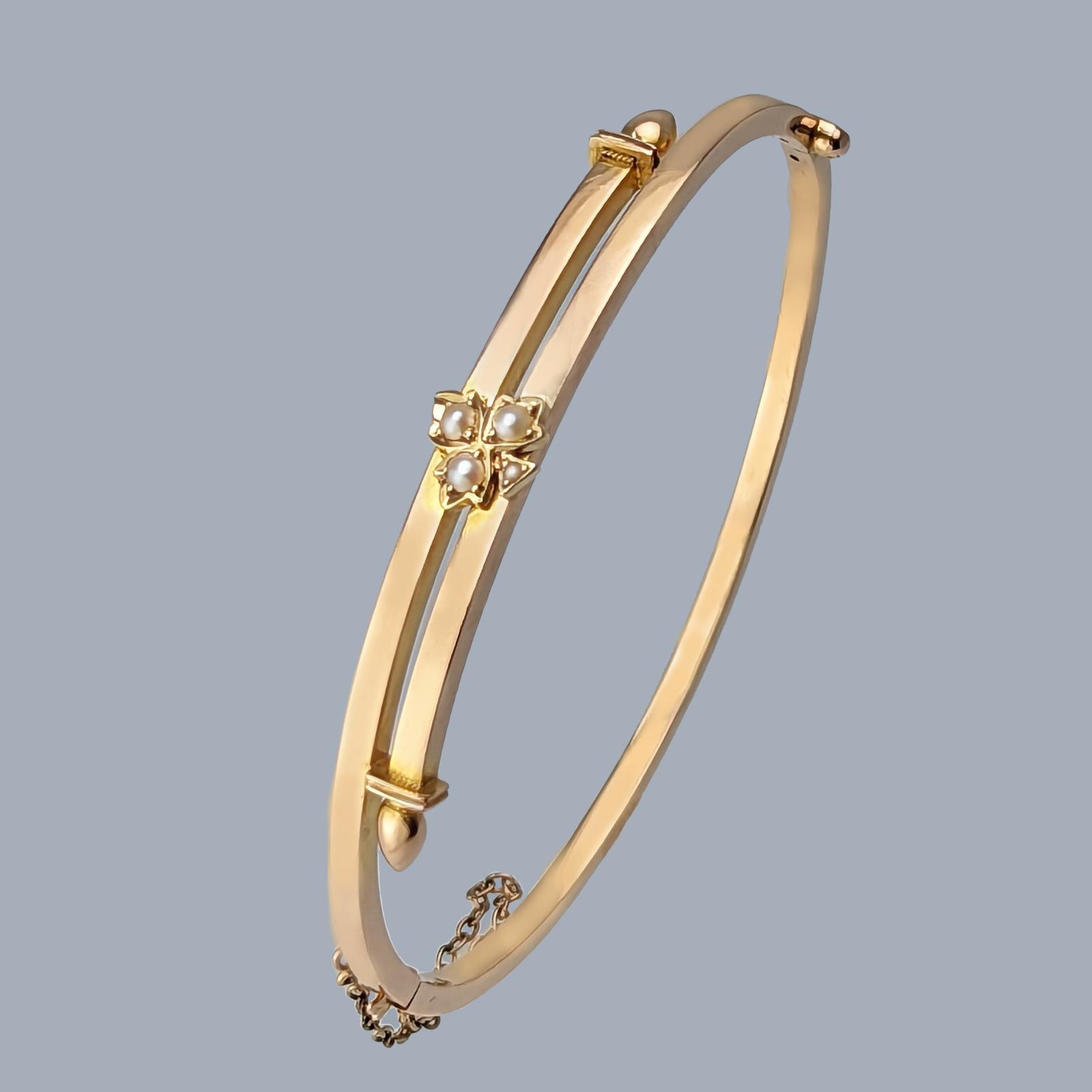 Antique 15ct Gold Pearl Clover Hinged Bangle Victorian Pearl Bracelet Circa 1890
