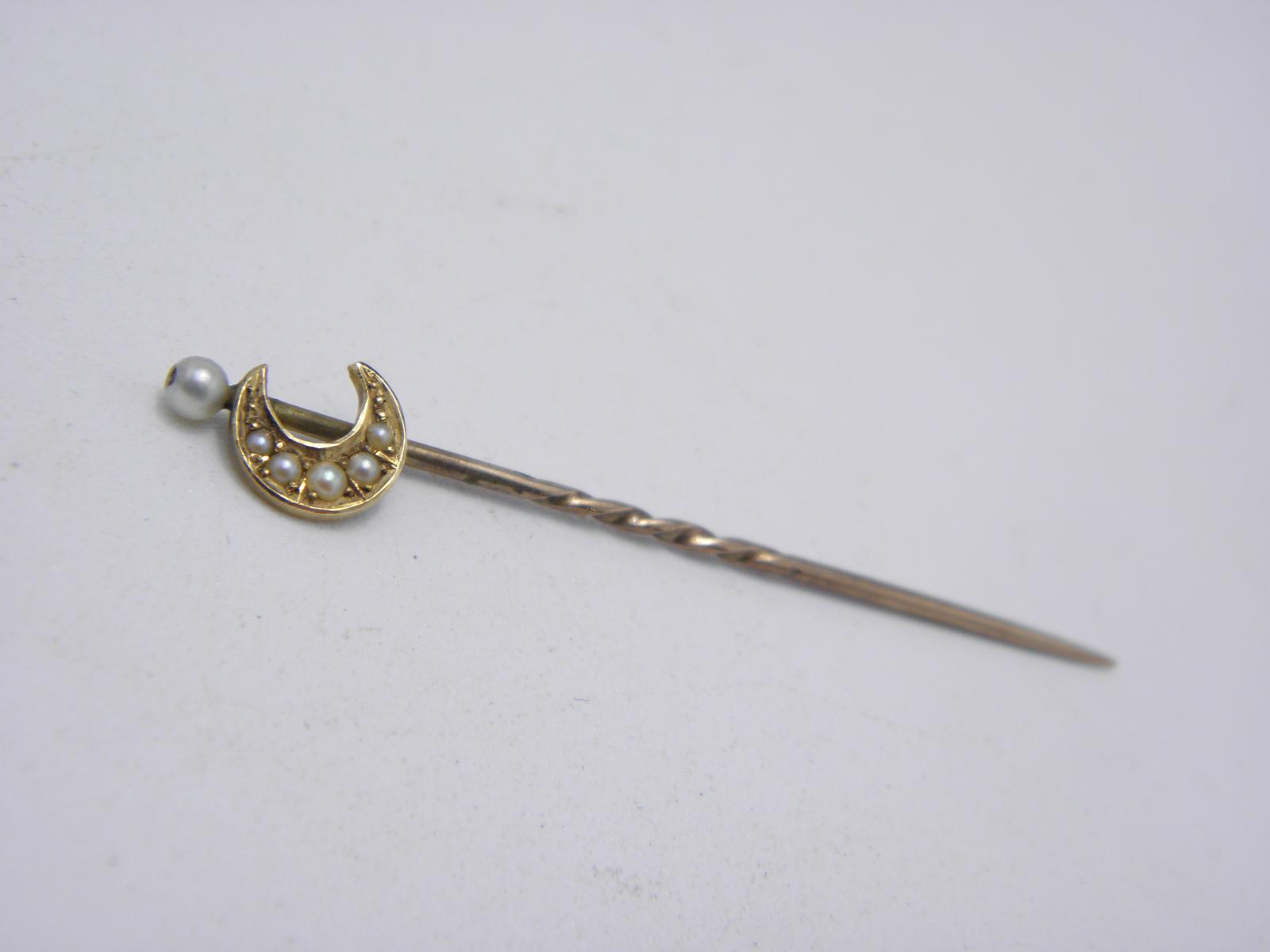 This Antique 15ct Gold Pearl Moon Tie Lapel Cravat Stock Pin C1890 High Quality is located in Cornwall, United Kingdom
