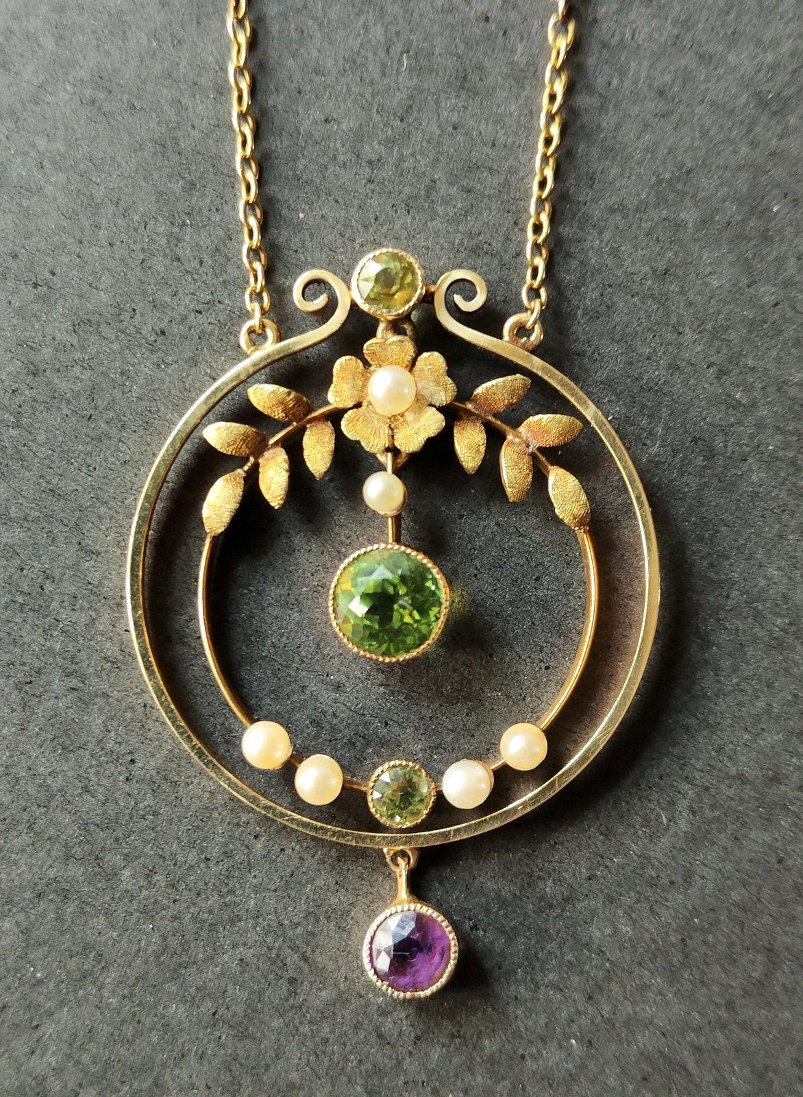 Antique 15ct Gold Peridot Amethyst Pearl Suffragette Pendant / Necklace