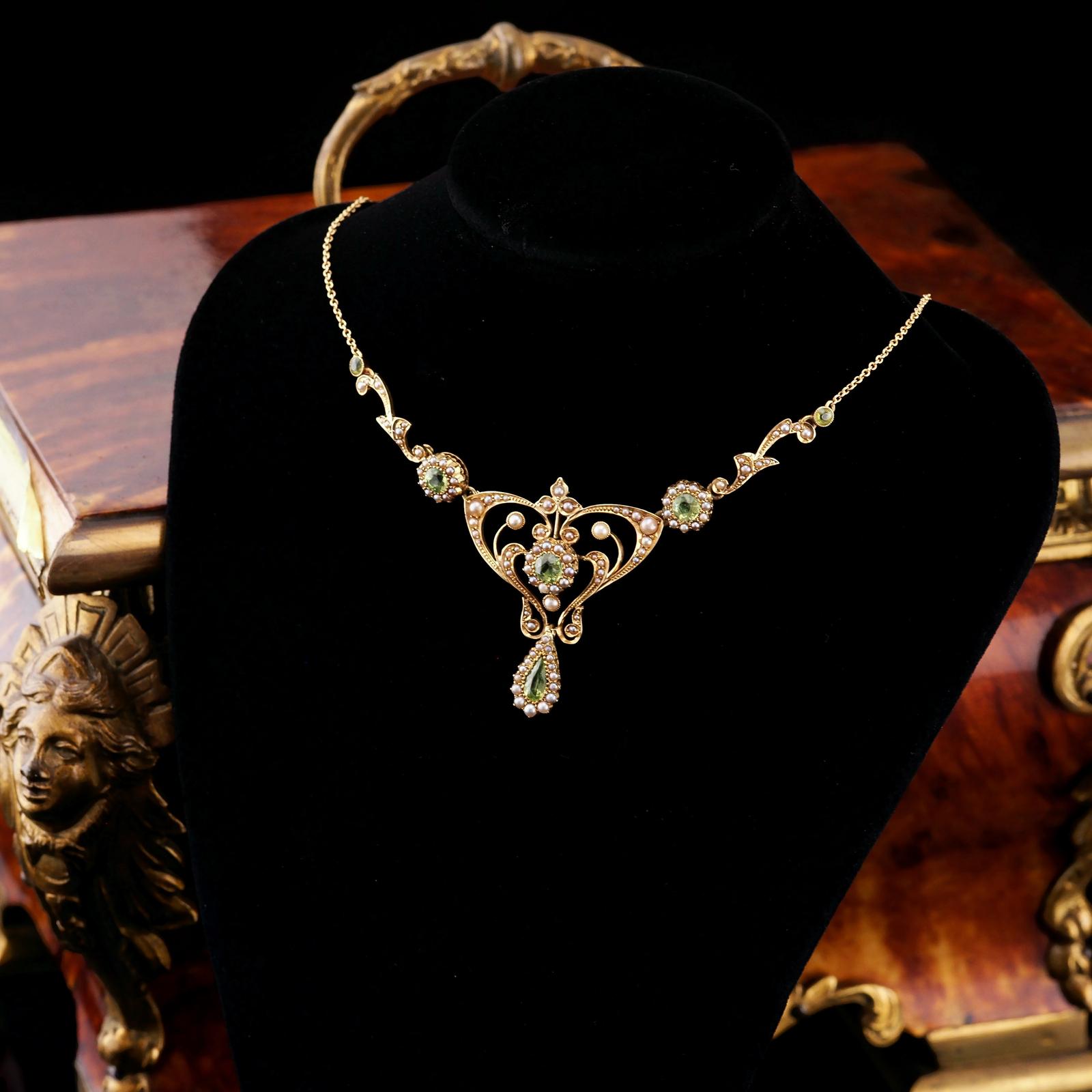 Antique 15ct Gold Peridot & Pearl Lavalier Necklace - Art Nouveau c.1900s (1 of 20)