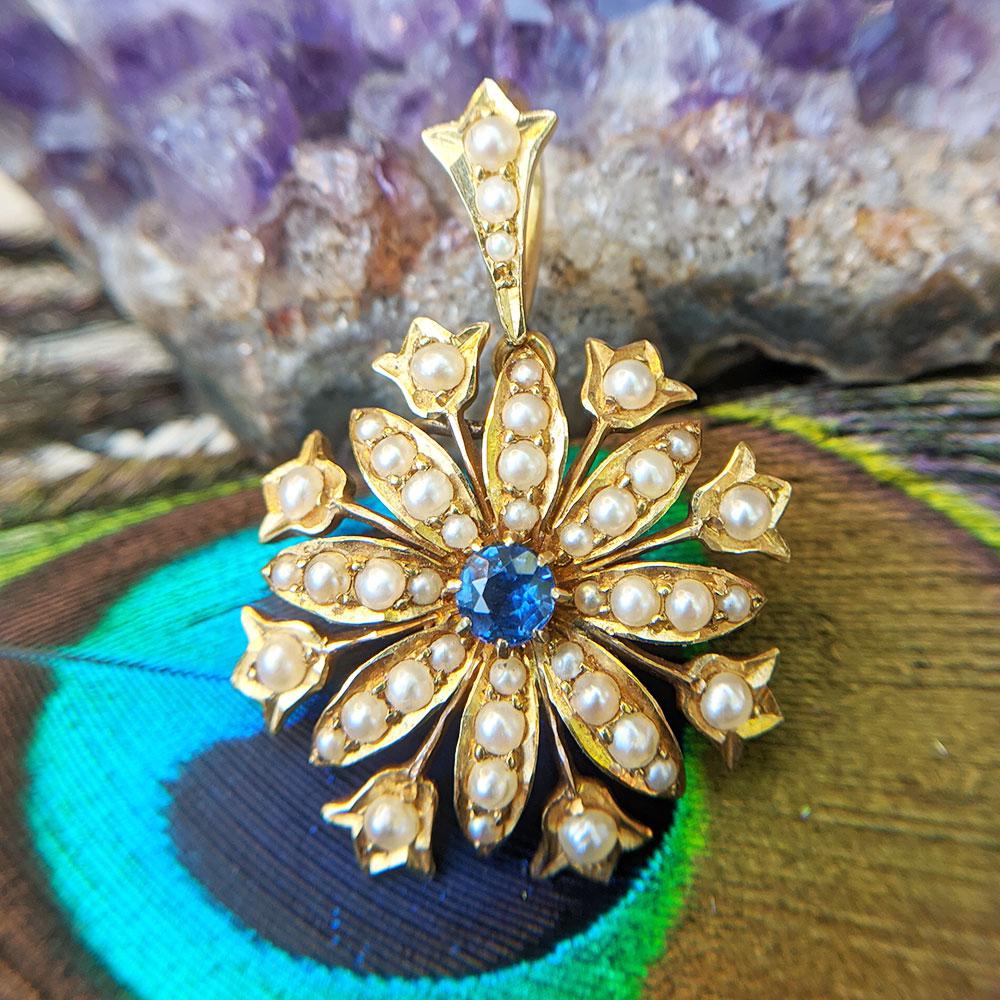 Antique 15ct Gold Sapphire & Pearl Floral Pendant Brooch