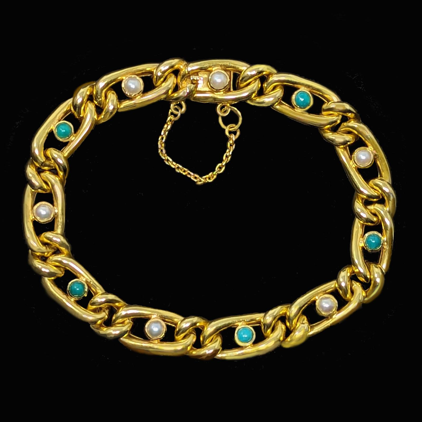 Antique 15ct Gold Turquoise & Pearl Curb Link Bracelet Victorian Bracelet Circa 1880