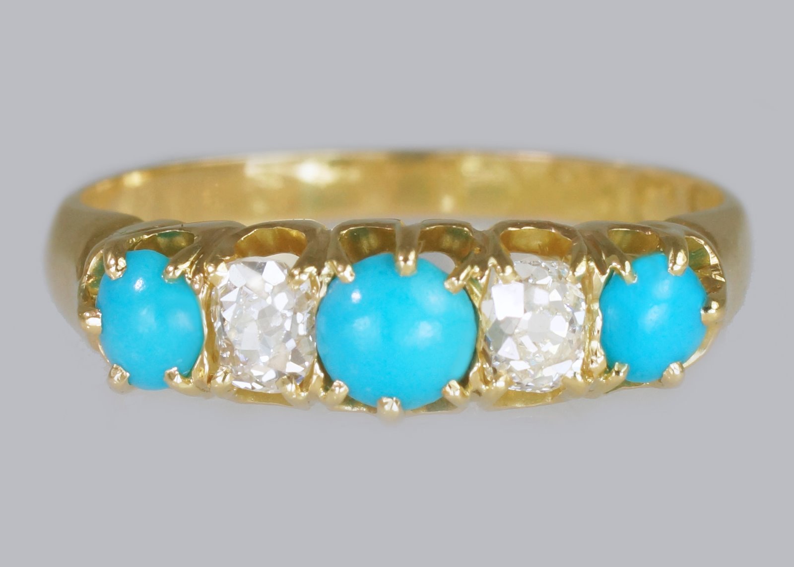 Antique 18ct Gold Turquoise & Old Mine Cut Diamond Ring Vintage Five Stone Ring