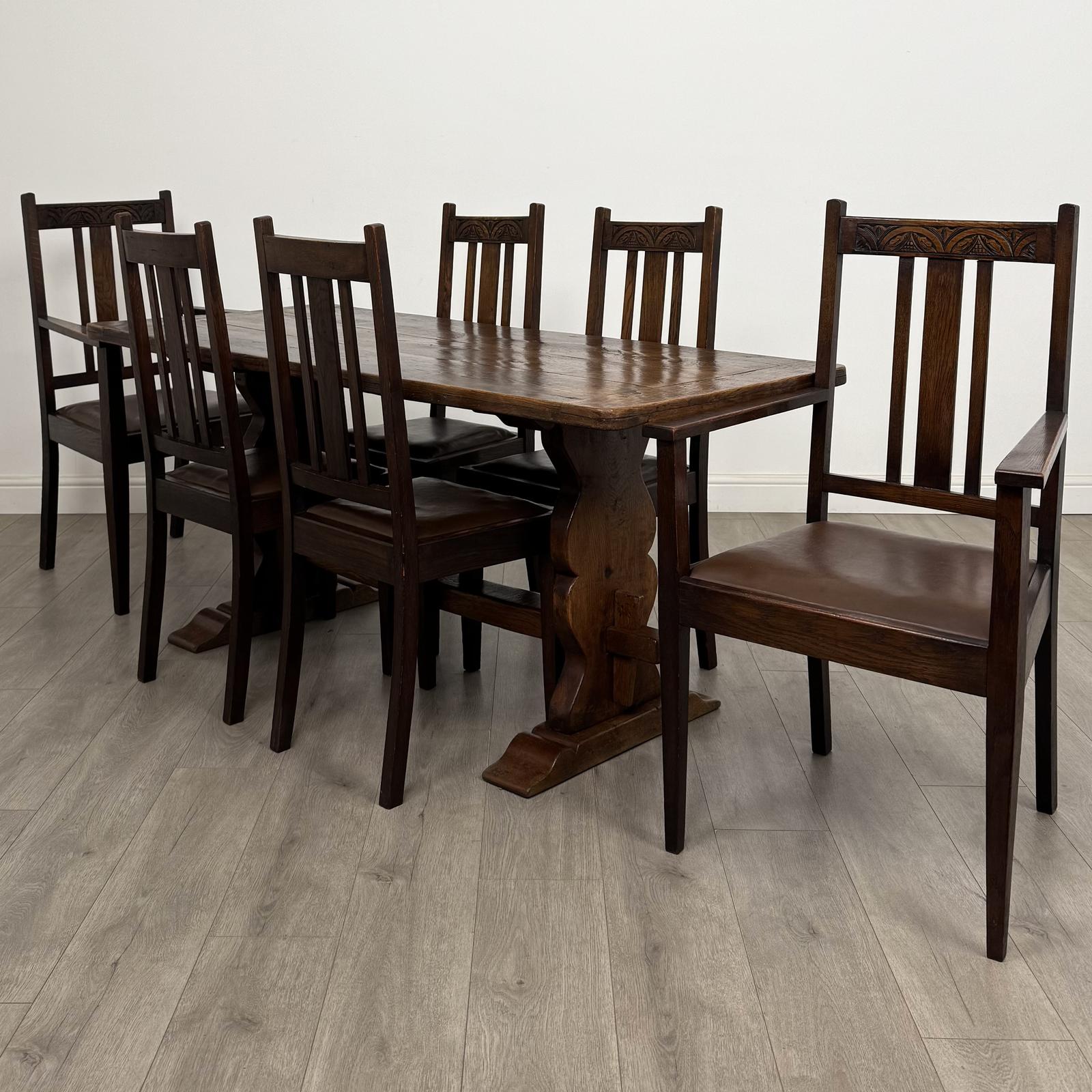 Antique 18th century oak dining table with a set of six dining chairs, a very well made and fine quality dining suite combining earlier craftsmanship with later complementary seating.