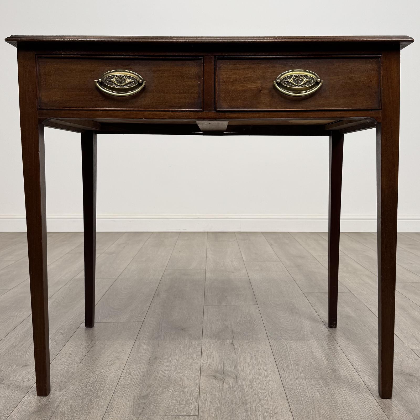 The table stands on elegant tapered legs and features two drawers to the front, each with its original brass handles. The mahogany displays a gorgeous grain and rich colour throughout, highlighting the craftsmanship and attention to detail.