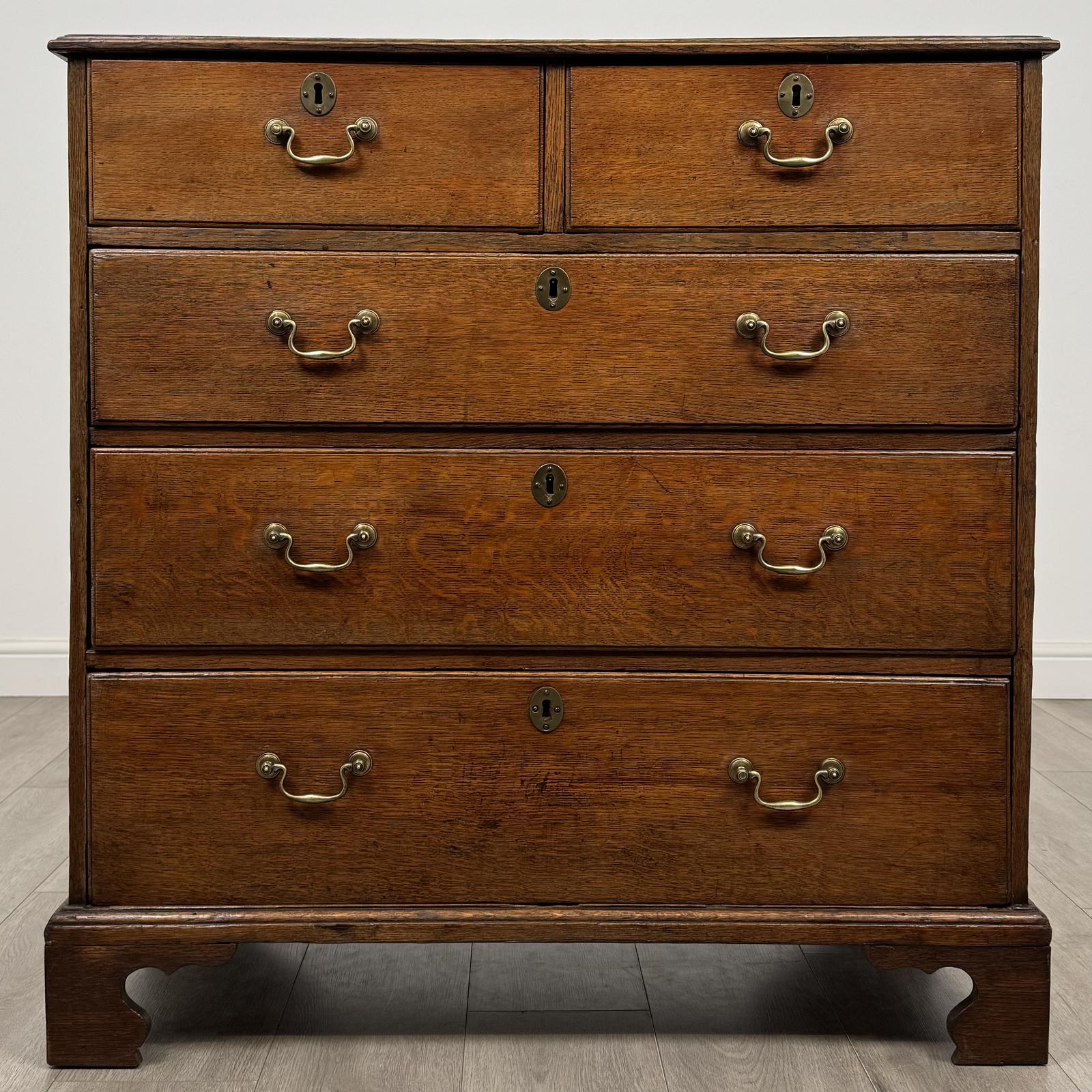 Antique 18th century Georgian chest of drawers in oak, a very well made and fine quality example showcasing classic period craftsmanship and timeless appeal. The chest features five drawers arranged as two small over three large, all retaining their original brass swan neck handles which complement the character and authenticity of the piece. Standing on traditional bracket feet, the chest displays beautiful oak grain and rich warm colour throughout, with lovely figuring visible across the drawer fronts and top. The proportions are well balanced, and the solid construction ensures both durability and practical everyday use.