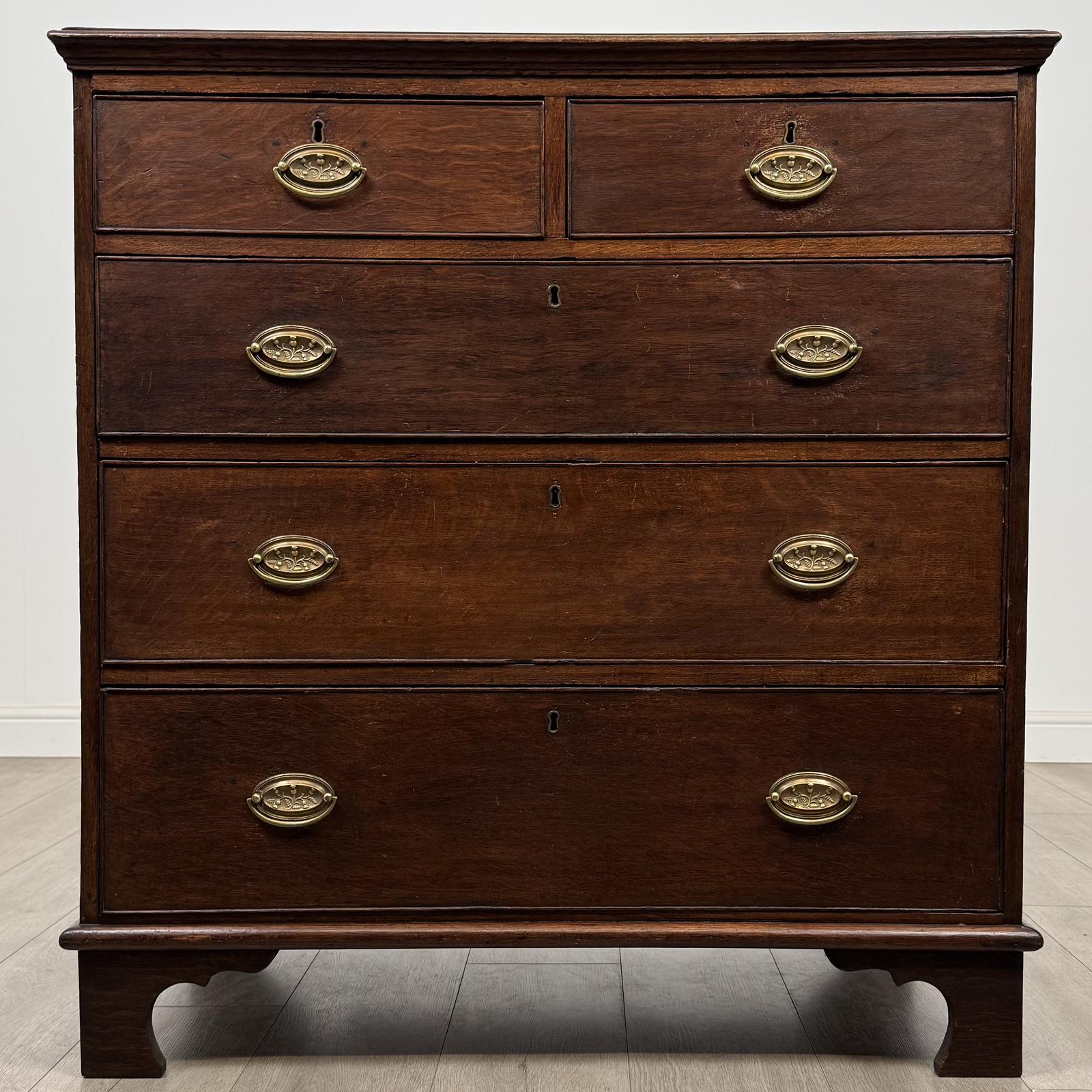 Antique 18th century Georgian chest of drawers in oak, a very well made and fine quality example of traditional period craftsmanship. The chest features five drawers in total, arranged as two small over three large, offering excellent storage while maintaining elegant proportions.