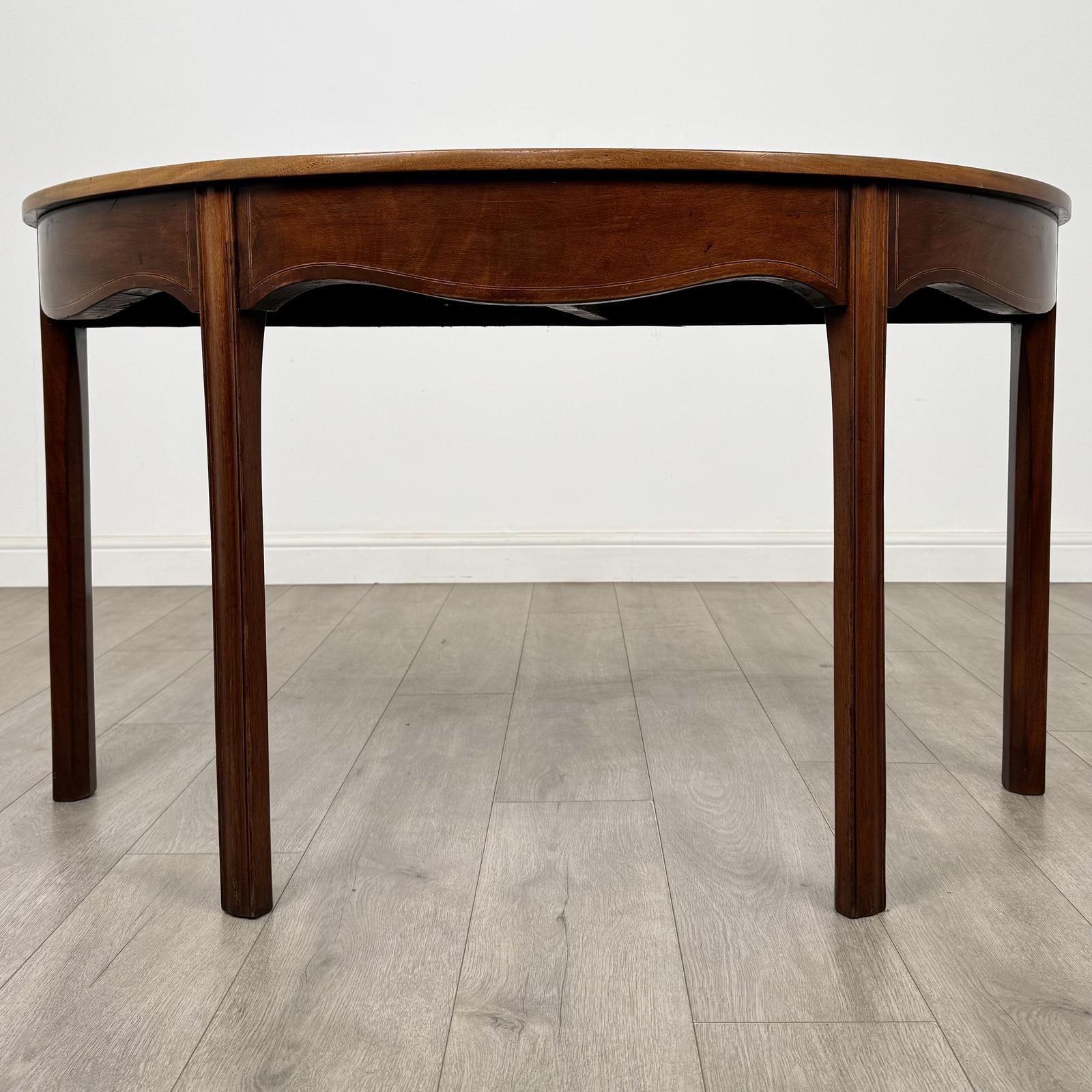 The table stands on four square legs and features a beautiful demi-lune shape, making it both practical and visually appealing. It is expertly inlaid with satinwood and ebony stringing, adding refined decorative detail and enhancing its classic Georgian character.