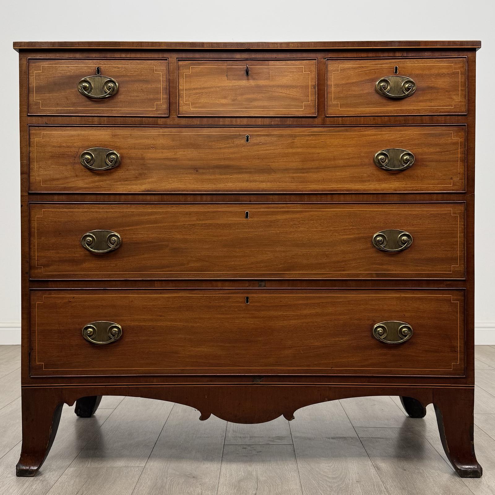 The piece is beautifully inlaid with satinwood stringing, adding subtle elegance and refinement to the rich mahogany. It stands on splay feet, giving it a balanced and classic Georgian form, while the overall construction reflects its high quality and period character.