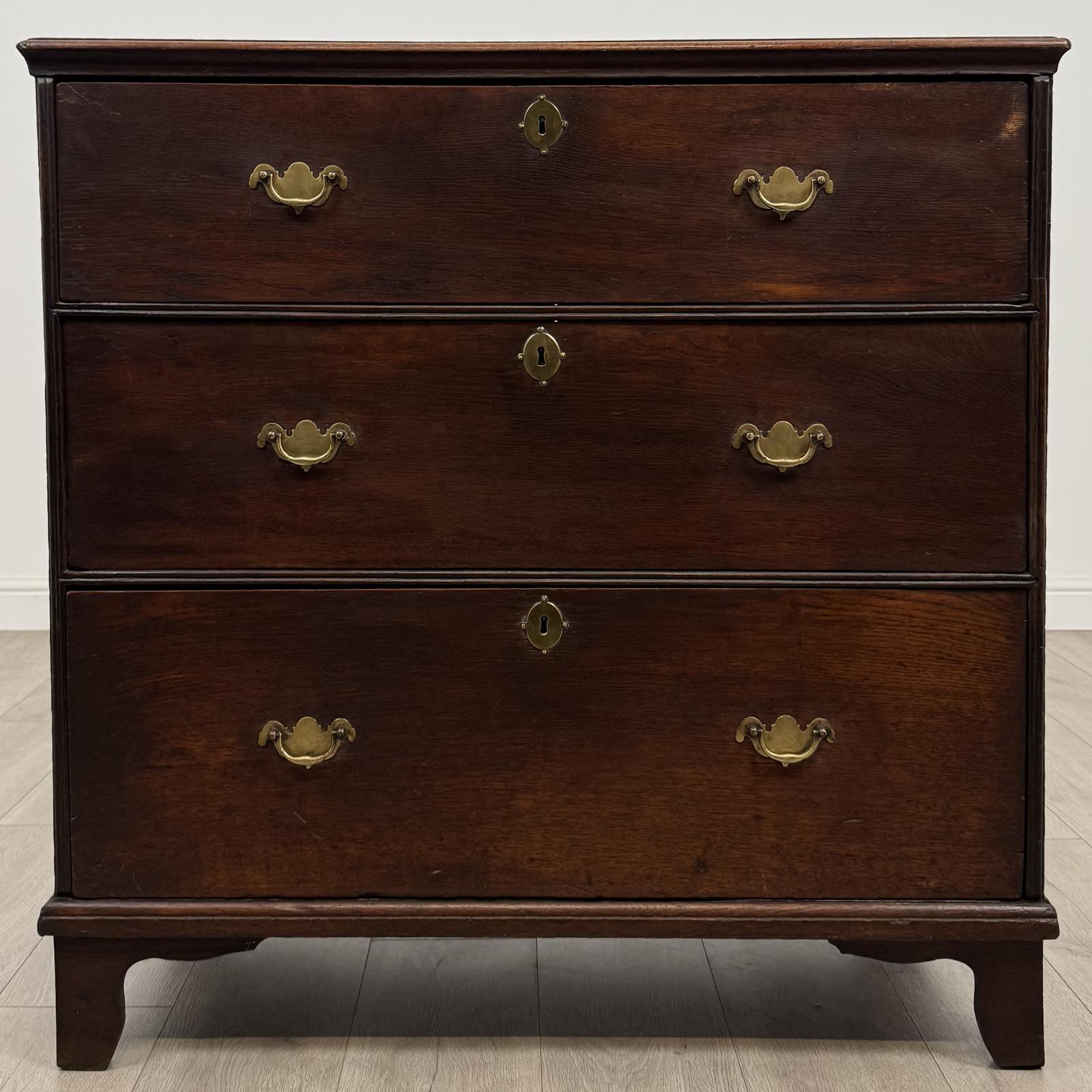 An antique 18th Century oak chest of drawers of good quality and exceptional craftsmanship. Very well made and solidly constructed, the chest features three large drawers to the front, each retaining its original brass handles, offering generous storage space. The piece stands on sturdy bracket feet and displays gorgeous grain and rich colour throughout, highlighting the quality of the oak.