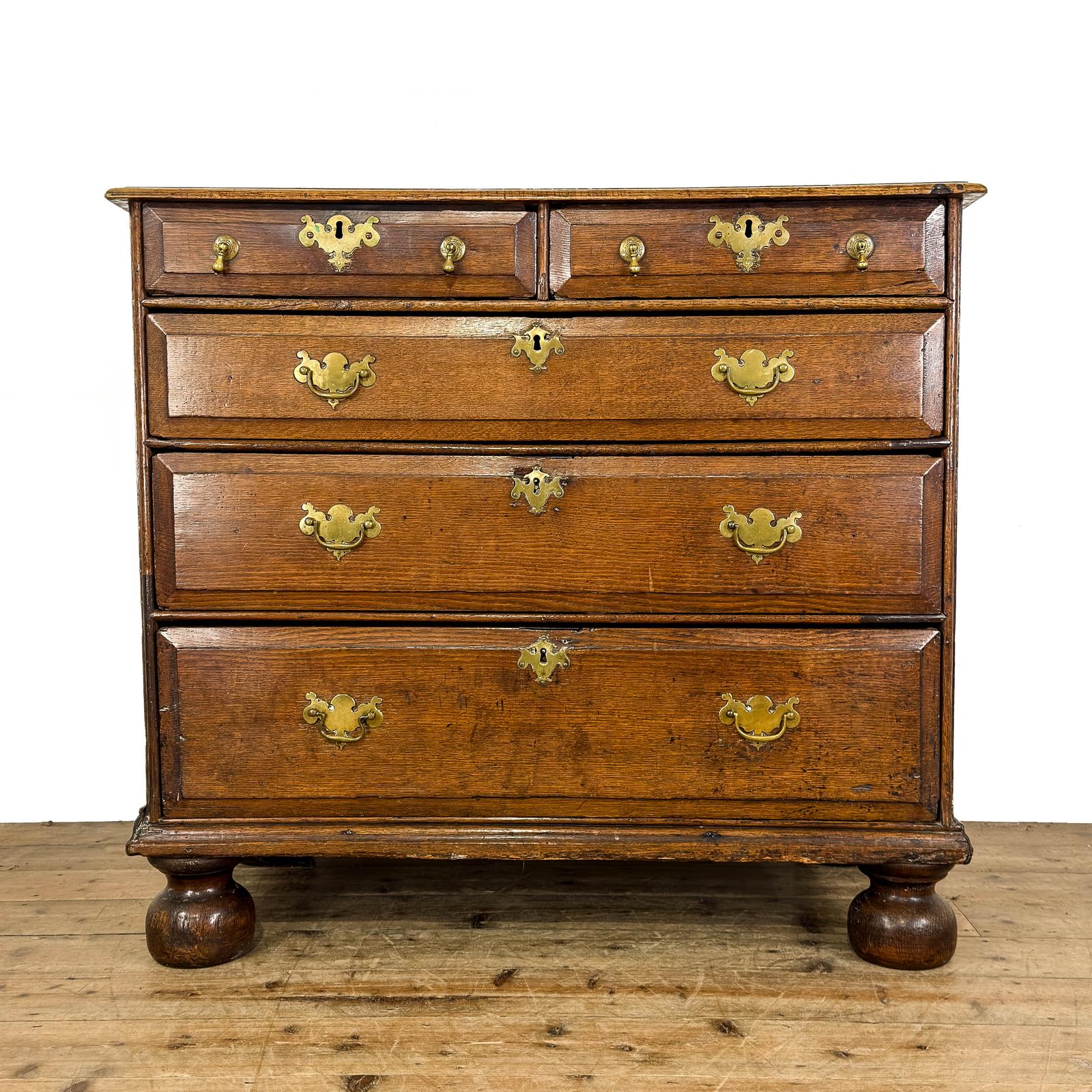 A handsome and well presented 18th century antique oak chest of drawers. The chest features a rectangular top above an arrangement of two short over three long drawers, each fitted with brass handles and escutcheons. Raised on bun feet, giving it a solid and traditional stance. Constructed from oak, the piece displays a rich, deep colour and good grain throughout, with plenty of character developed over time. A classic and practical example of early country furniture.