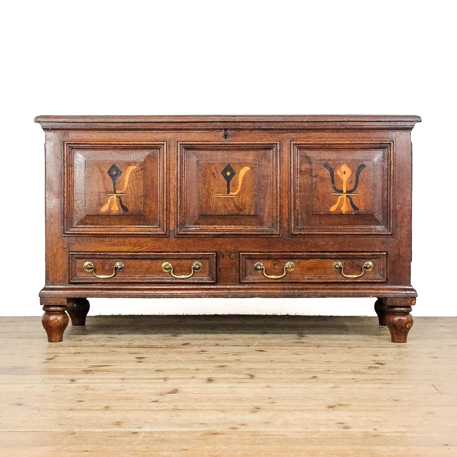 The oak has matured to a deep, warm tone with a wonderful patina throughout. The front features three fielded panels, each centred with decorative inlaid motifs. The lid is traditionally hinged and surmounted by a moulded cornice, and the chest is raised on turned bun feet. Overall, a lovely example.