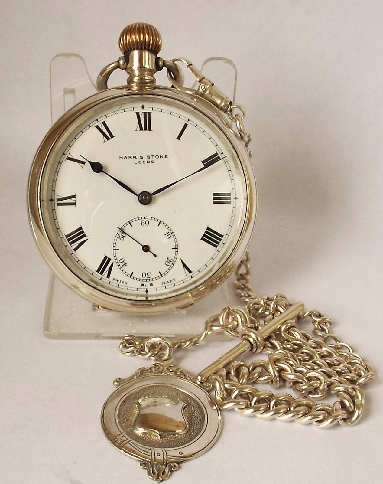 Antique 1913 Silver Harris Stone Pocket Watch & Chain