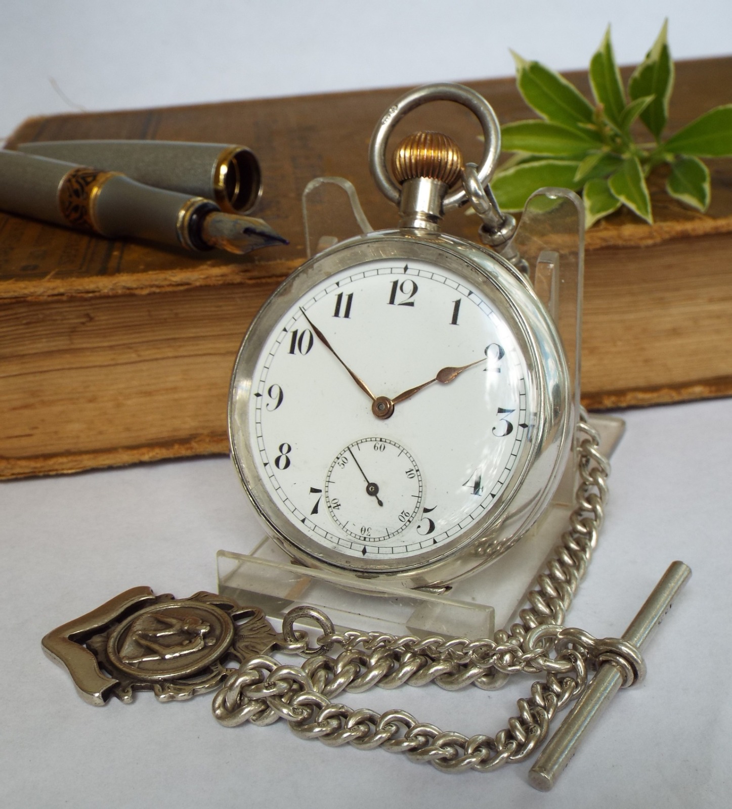 Antique 1913 Swiss Silver Pocket Watch & Chain