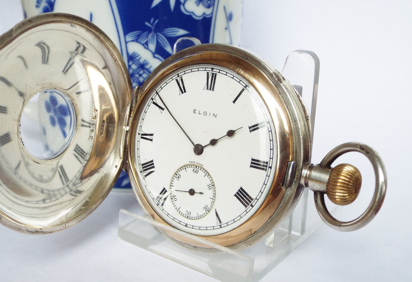 Antique 1918 Silver Elgin Half Hunter Pocket Watch