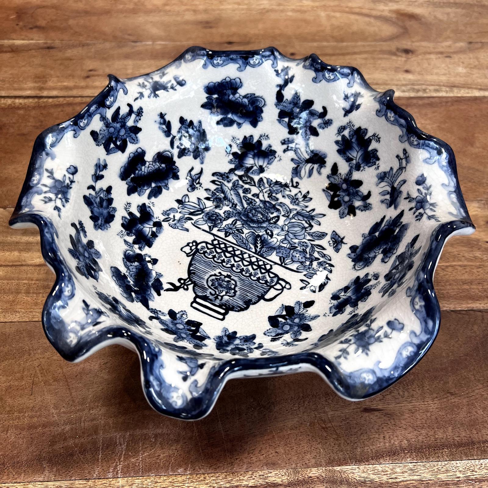 Antique 1920s Chinese Porcelain Fruit Bowl with Ruffle Lip & Crackle Glaze