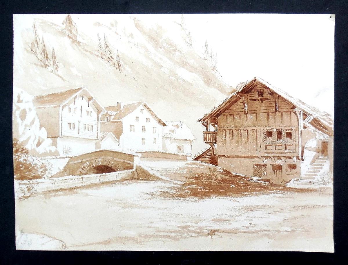 Antique 19th Century (1870) Sepia Painting Andermatt Switzerland Chalet in Alpine Village
