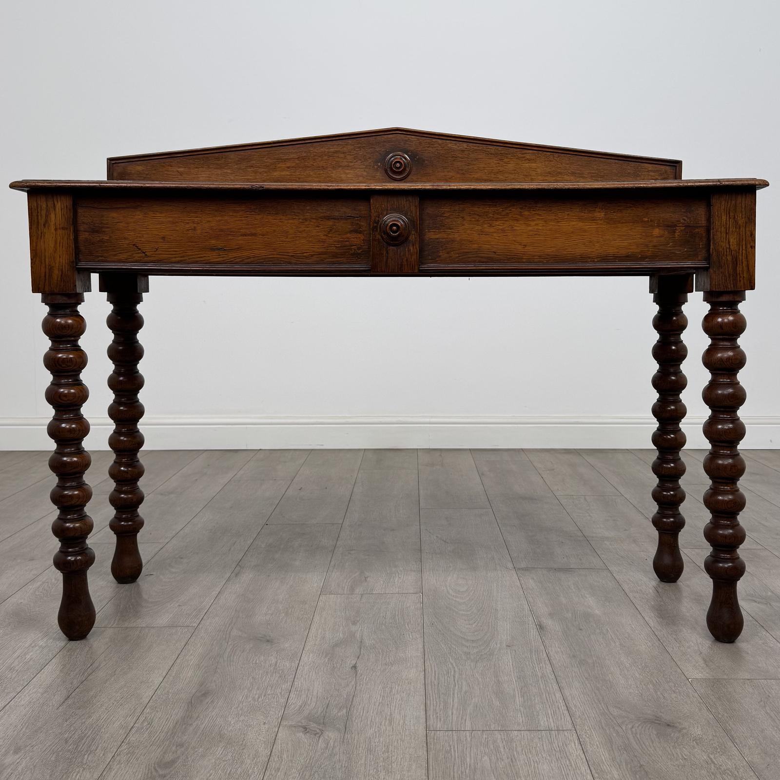 Antique 19th century bobbin-turned Victorian writing table in oak, a very well-made and good-quality piece.